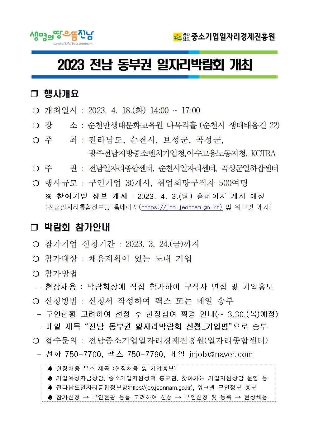 - 메일 제목 “전남 동부권 일자리박람회 신청_기업명”으로 송부