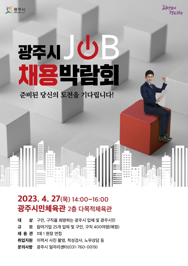 | 구직자에게는 취업의 기회를, 구인 기업에게는 인재 채용의 기회를 제공하기 위 한 『2023년 광주시 상반기 채용박람회 일 잡(JOB)고 꿈 DREAM!』 을 개최하오니 관심 있는 기업대표 여러분의 많은 참여 바랍니다. |