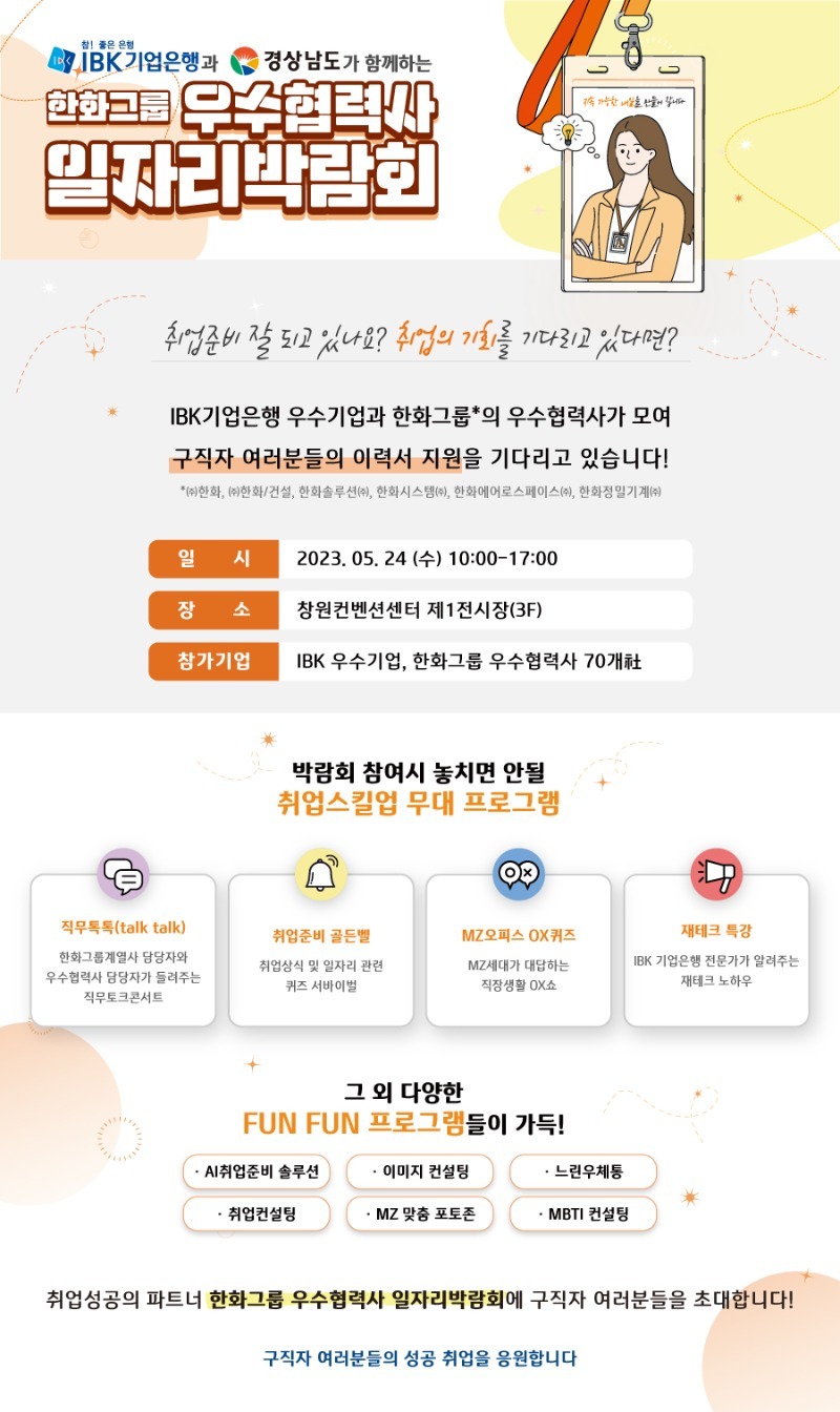 IBK 우수기업, 한화그룹 우수 협력사 등 70여개사, AI취업준비 솔루션, 직무진단 컨설팅, 이력서 컨설팅 지원, 2023 한화그룹 우수협력사 일자리박람회, 일자리박람회, 채용박람회, i-ONE JOB, IBK기업