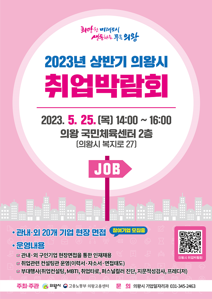 의왕시는 오는 5월 25일 오후 2시부터 4시까지 의왕국민체육센터에서 ‘2023년 상반기 취업박람회’를 개최예정입니다.