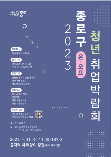 2023 종로구 청년 취업박람회 온/오프 행사에 대한 자세한 내용 및 참여를 희망하시는 분들은 아래 링크통해 참여해보시기 바랍니다.