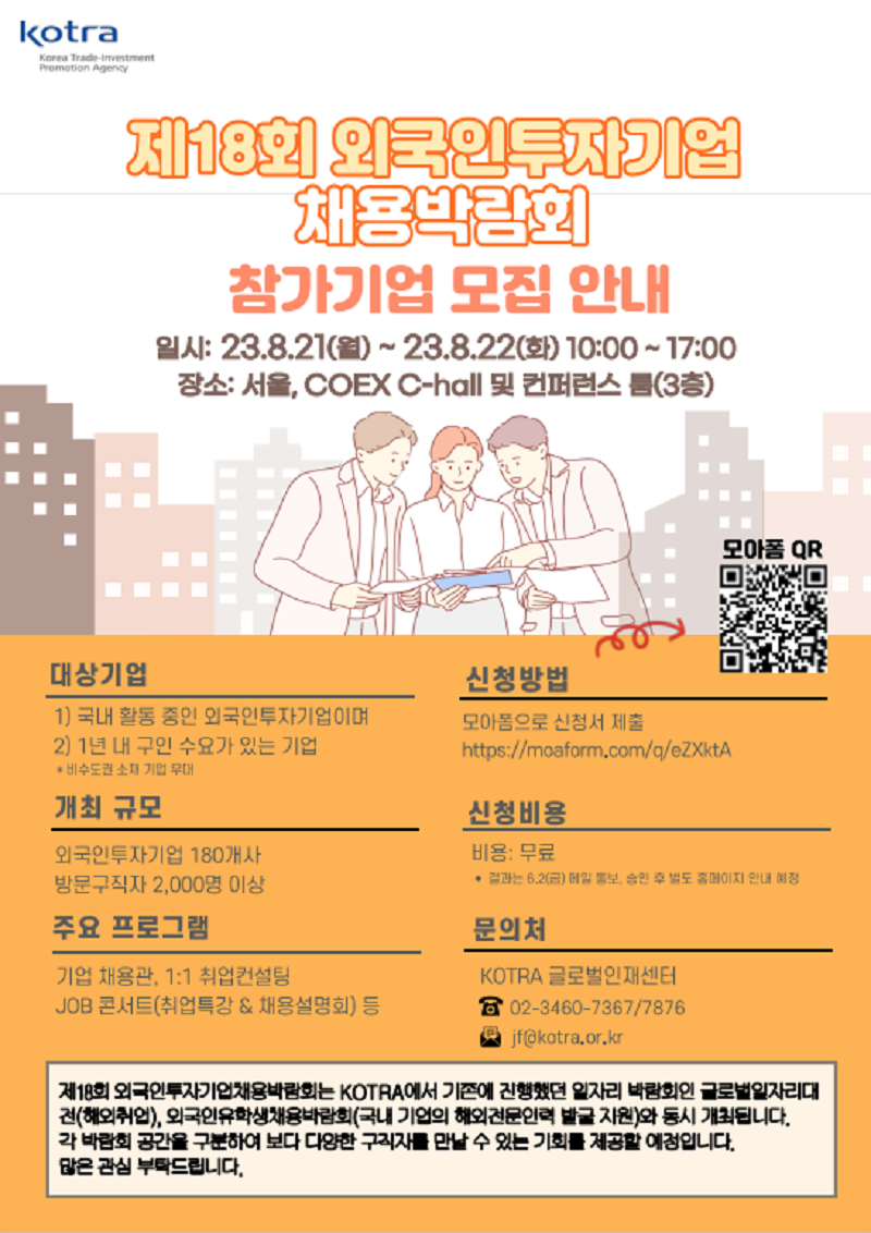 ▶ 문의처 : KOTRA 글로벌인재센터 (02-3460-7367/7876, jf@kotra.or.kr)