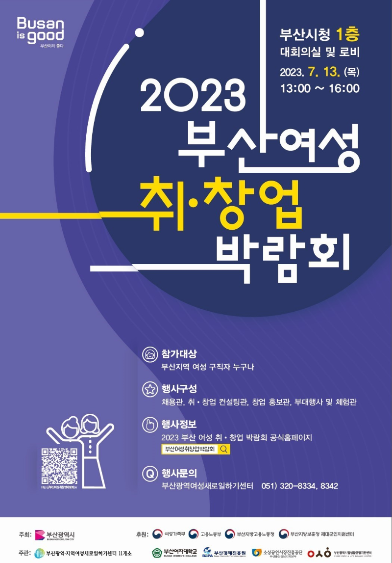 부산시와 부산지역여성새로일하기 센터11개소는 7월13일 2023 부산 여성 취·창업 박람회를 개최 할 예정입니다.