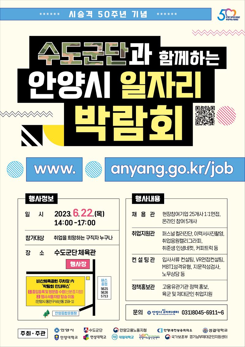 시승격 50주년 기념으로 수도군단과 함께하는 안양시 일자리 박람회가 수도군단체육관에서 열립니다.