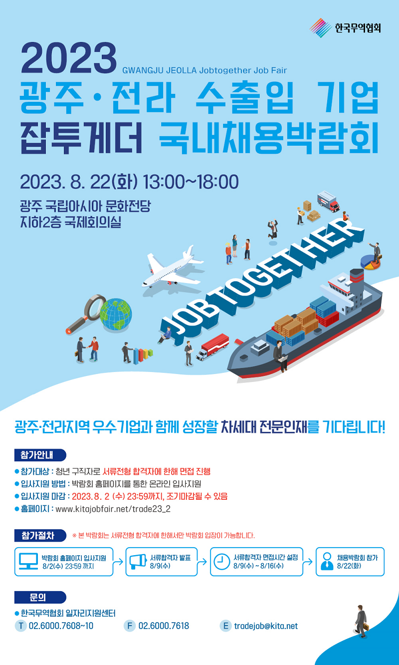 한국무역협회 일자리지원센터입니다.2023 광주·전라 수출입 기업 잡투게더 국내채용박람회 홈페이지가 오픈되었습니다.