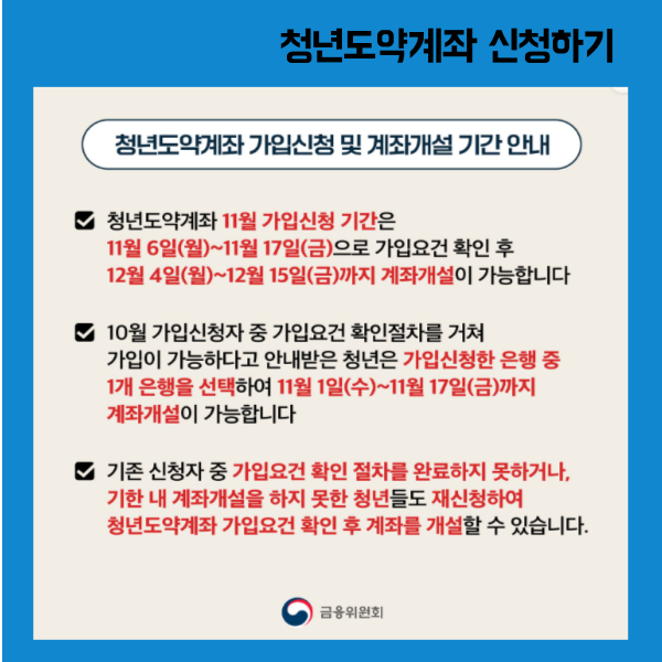 11월 가입신청 기간 : 11월 6일(월)~11월 17일(금)이며 10월 가입자의 계좌개설 가능 기간 : 11월 1일(수)~11월 17일(금)까지입니다. 10월미가입자는 11월 가입이 가능하며 11월 미가입자는 12월 가입기간에 가입이 가능하니 아래 링크를 통해 가입기간에 대해 확인 하시기 바랍니다.