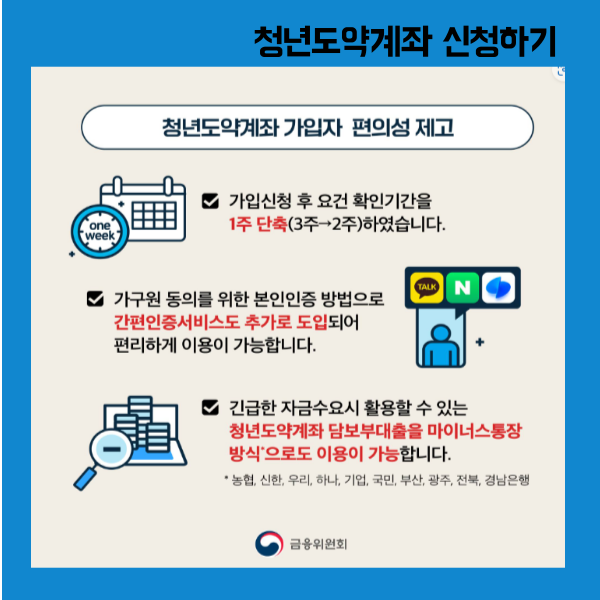 청년도약계좌 신청방법과 신청조건은 정년도약계좌홈페이지에서 확인할수 있습니다. 청년도약계좌는 청년의 중장기 자산형성 지원을 위한 정책형 금융상품으로, 만기 5년(60개월) 동안 매월 70만원 한도 내에서 자유롭게 납입하면 매월 최대 6%의 정부기여금을 지급하고 이자소득에 대한 비과세 혜택을 제공하는 상품입니다.청년도약계좌은 11월6일 부터 청년도약계좌 홈페이지 에서 가입이 가능하니 아래 청년도약계좌 홈페이지 링크를 통해 청년도약 계좌 신청 링크를 통해 신청여부 확인을 상담신청 하시는것을 권해드립니다.청년도약계좌 홈페이지를 통해 직접 청년도약계좌에 신청하시길바랍니다.