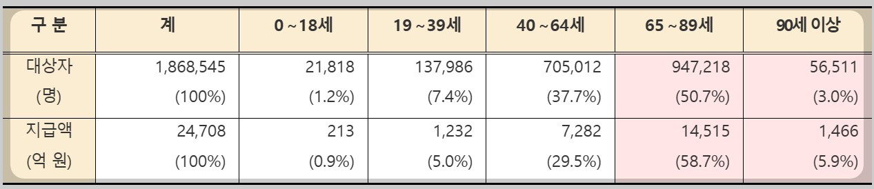 연령별로는 65세 이상 대상자 100만 3,729명이 1조 5,981억 원을 본인부담상한액 초과금으로 받아, 전체 대상자의 53.7%, 지급액의 64.6%를 차지하였다.