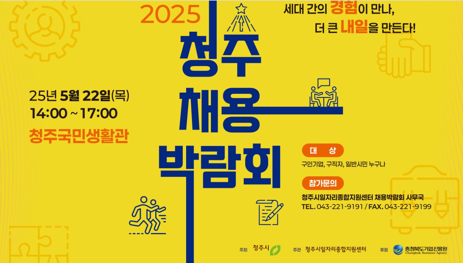 청주에서는 취업에 어려움을 겪는 구직자에게 양질의 일자리를 제공하고, 구인난에 겪고있는 기업에 도움을 주고자 2025 청주 채용박람회를 25년 5월22일 오후 2시부터 5시까지 청주국민생활관에서 개최예정입니다. 이번 청주채용 박람회에는 관내 기업이 참가해 1:1 기업 현장 면접을 하고, 구직자들을 채용할 예정이며 취업정보관을 운영하고, 이력서 사진촬영 등 각종 부대행사가 준비중입니다. 청주 채용박람회을 찾는 시민은 누구나 참여할 수 있으니 많은 관심과 참여바랍니다.