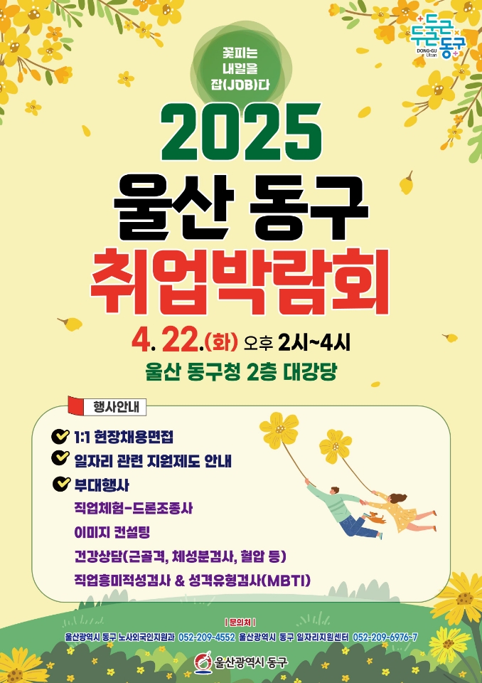 "꽃피는 내일을 잡(JOB)다" 2025 울산 동구 취업박람회" 구직자에게 일자리와 취업 정보를 제공하고구인업체에 우수인재 채용의 기회를 마련하고자취업박람회를 개최합니다