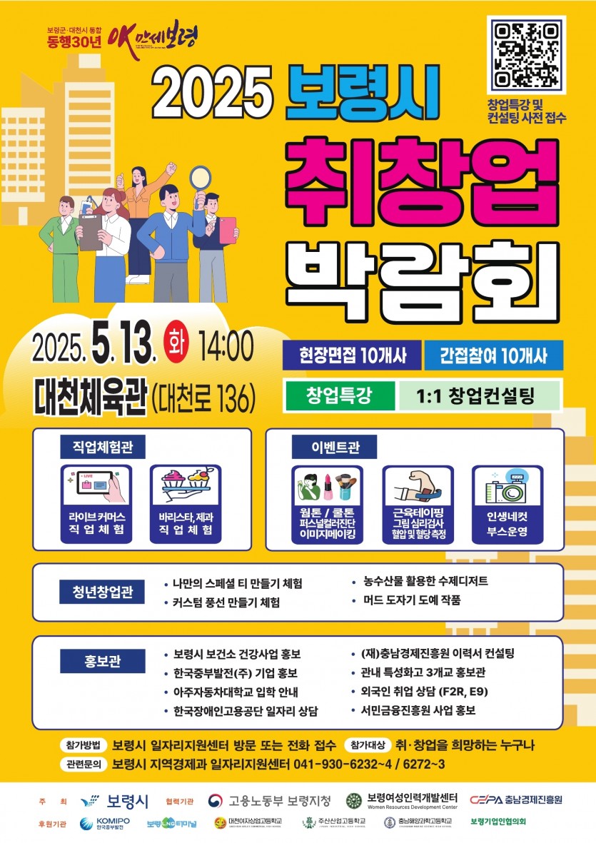 관내 청년을 비롯한 보령시민의 취업 기회와 기업의 맞춤형 인재를 발굴하는 장을 마련하여 맞춤형 고용과 일자리 창출을 동시에 도모하고자 실시하는 2025년 보령시 취창업 박람회 개최 관련하여 현장면접 및 채용대행 업체를 다음과 같이 안내하오니 구직자분들의 많은 참여 바라며 이번 보령시 취창업박람회에 참가하고자 하시는 분들은 아래 링크를 통해 취업박람회 참여기업및 부대행사, 준비물등 참가방법을 확인 하시기 바랍니다.