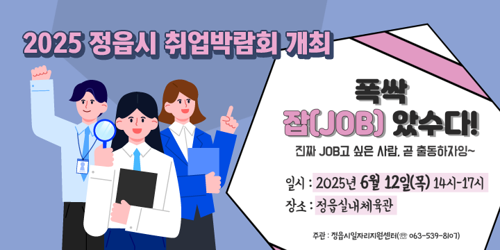 취업을 희망하는 구직자와 인재를 필요로 하는 기업체의 만남의 장인 「2025 정읍시 취업박람회」를 아래와 같이 개최하오니 많은 참여 바랍니다. 이번 취업박람회에 참가하고자 하시는 분들은 아래 링크를 통해 취업박람회 참여기업및 부대행사, 준비물등 참가방법을 확인 하시기 바랍니다.