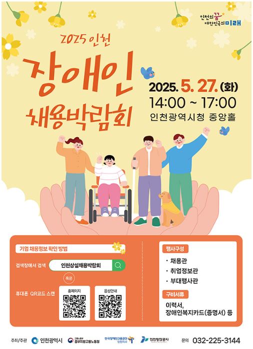 인천시에서는 5월27일 인천광역시청 중앙홀에서 2025 인천장애인 일자리박람회를 개최합니다. 아래 인천장애인일자리박람회 바로가기 링크를 통해 이력서 사전 등록및 이력서를 업로드 하시기 바랍니다.일자리박람회에 참가하고자 하시는 분들은 아래 링크를 통해 일자리박람회 참여기업및 부대행사, 준비물등 참가방법을 확인 하시기 바랍니다.