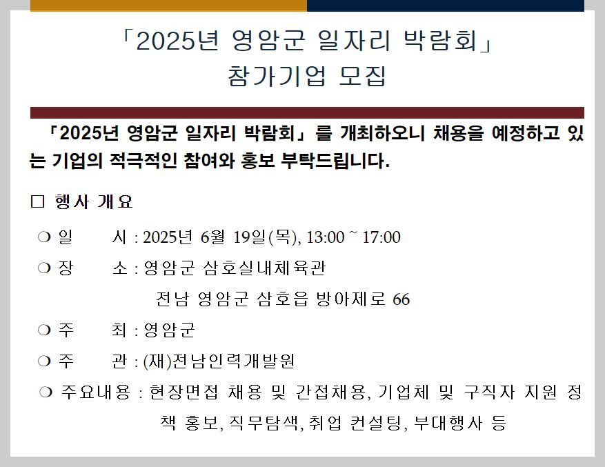 2025년 영암군 일자리 박람회」를 개최하오니 채용을 예정하고 있는 기업께서는 적극적인 참여 부탁드립니다.일자리박람회에 참가하고자 하시는 분들은 아래 링크를 통해 일자리박람회 참여기업및 부대행사, 준비물등 참가방법을 확인 하시기 바랍니다.
