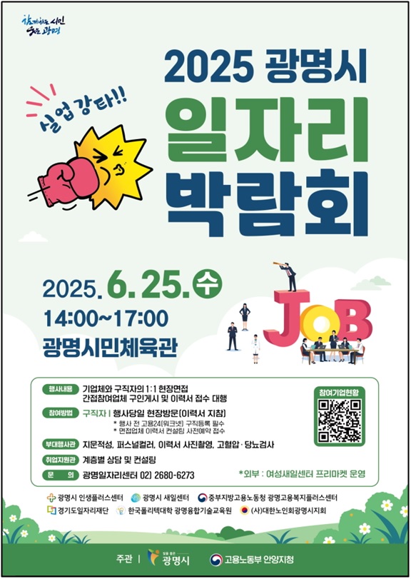 광명시에서는 취업에 어려움을 겪는 구직자에게 양질의 일자리를 제공하고, 구인난에 겪고있는 기업에 도움을 주고자 2025 광명시 일자리박람회를 6월 25일 오후 2시부터 5시까지 광명시민체육관에서 개최예정입니다. 일자리박람회에 참가하고자 하시는 분들은 아래 링크를 통해 일자리박람회 참여기업및 부대행사, 준비물등 참가방법을 확인 하시기 바랍니다.