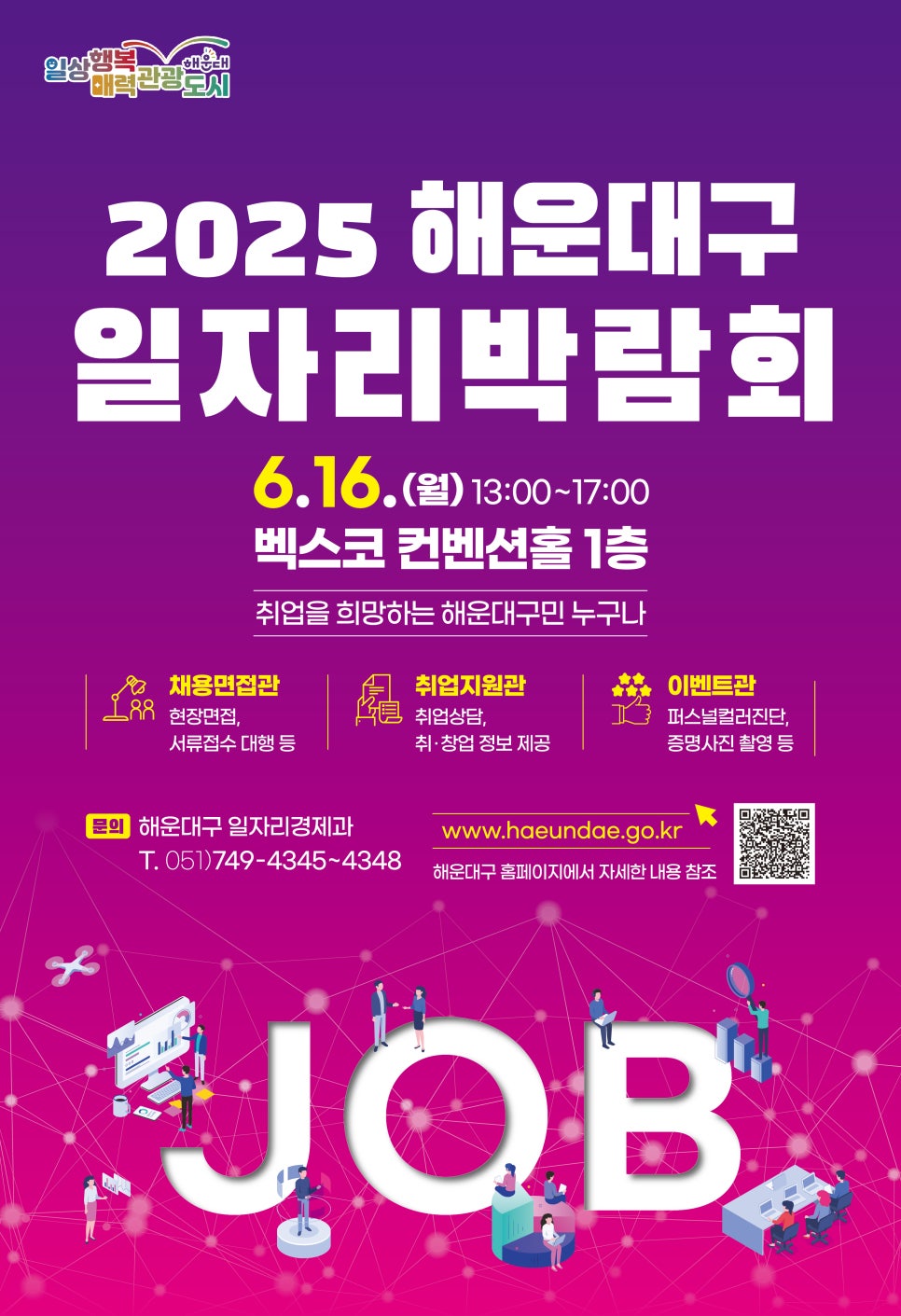 해운대구에서는 취업에 어려움을 겪는 구직자에게 양질의 일자리를 제공하고, 구인난에 겪고있는 기업에 도움을 주고자 2025 해운대구 일자리박람회를 6월 16일 오후 1시부터 5시까지 벡스코컨벤션홀1층에서 개최예정입니다. 일자리박람회에 참가하고자 하시는 분들은 아래 링크를 통해 일자리박람회 참여기업및 부대행사, 준비물등 참가방법을 확인 하시기 바랍니다.