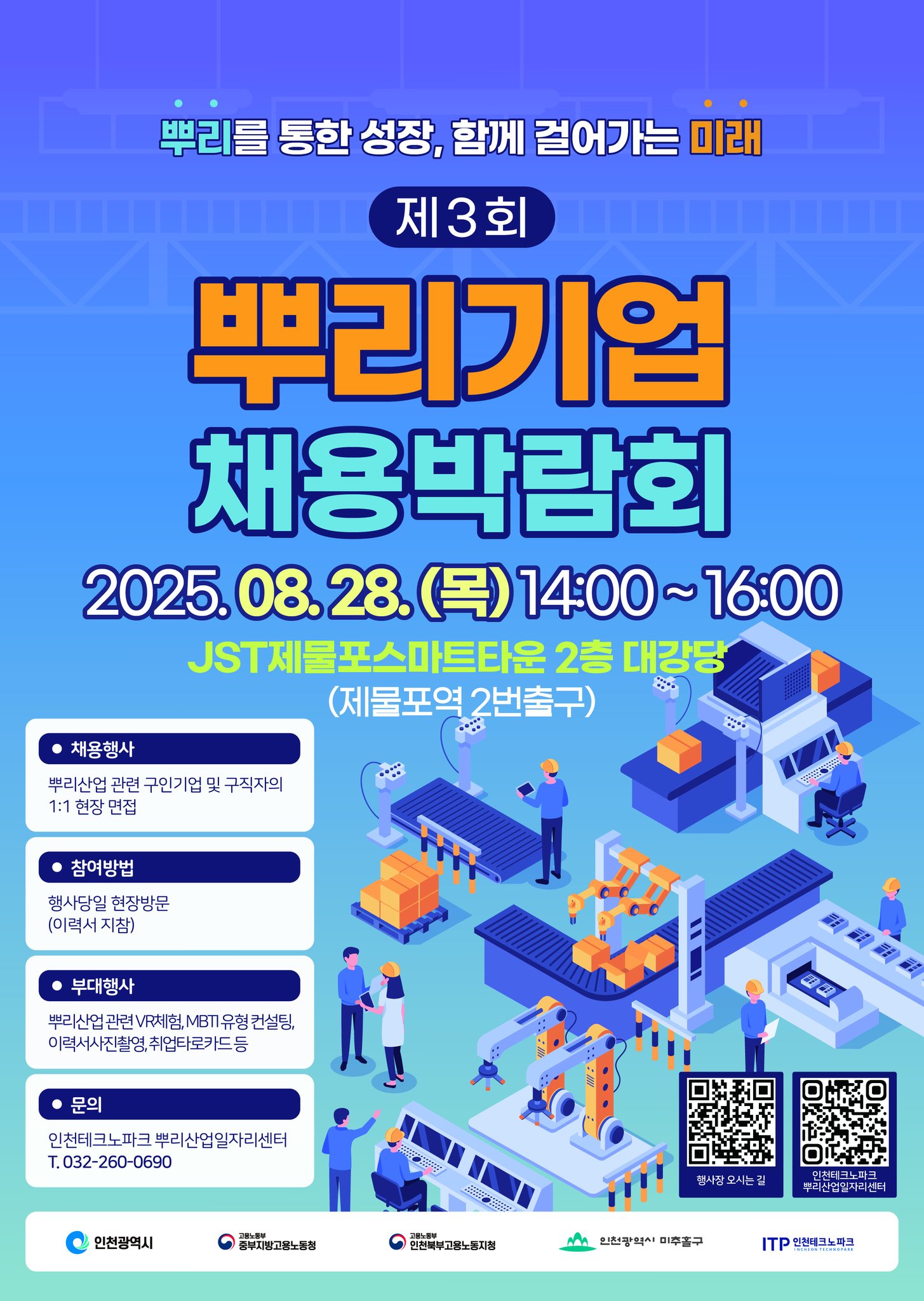 인천테크노파크(#인천TP)와 인천시는 뿌리산업 인력난 해소와 지역 고용 활성화를 위해 오는 28일(목) 제물포스마트타운 2층 대강당에서 ‘2025년 제3회 뿌리기업 채용박람회’를 개최합니다.