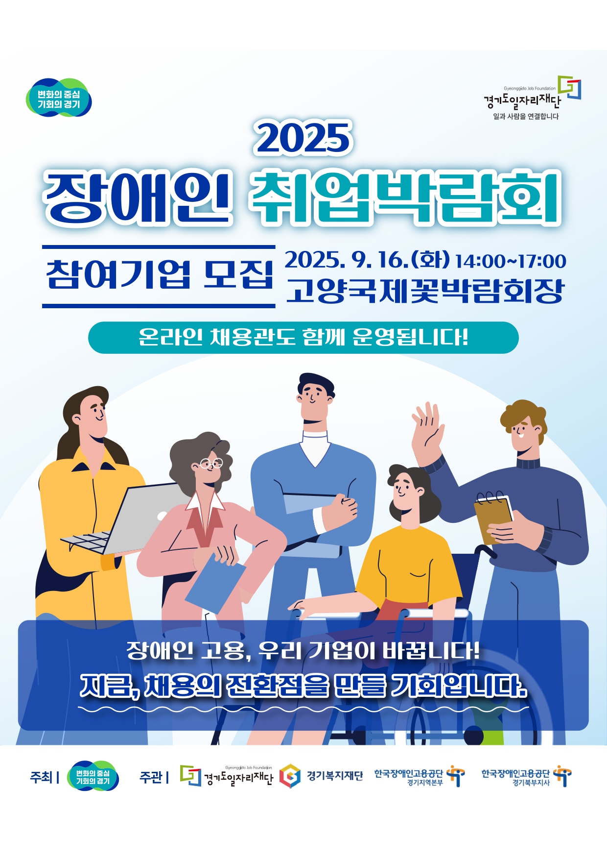 2025년 장애인 취업박람회에 참여할 기업을 모집합니다. 장애인 채용을 희망하는 기업 누구나 참여 가능합니다. 기타 자세한 모집요강 및 세부 내용은 상세페이지에서 내용을 참고하시기 바랍니다. 취업박람회에 참가하고자 하시는 분들은 아래 링크를 통해 취업박람회 참여기업및 부대행사, 준비물등 참가방법을 확인 하시기 바랍니다.