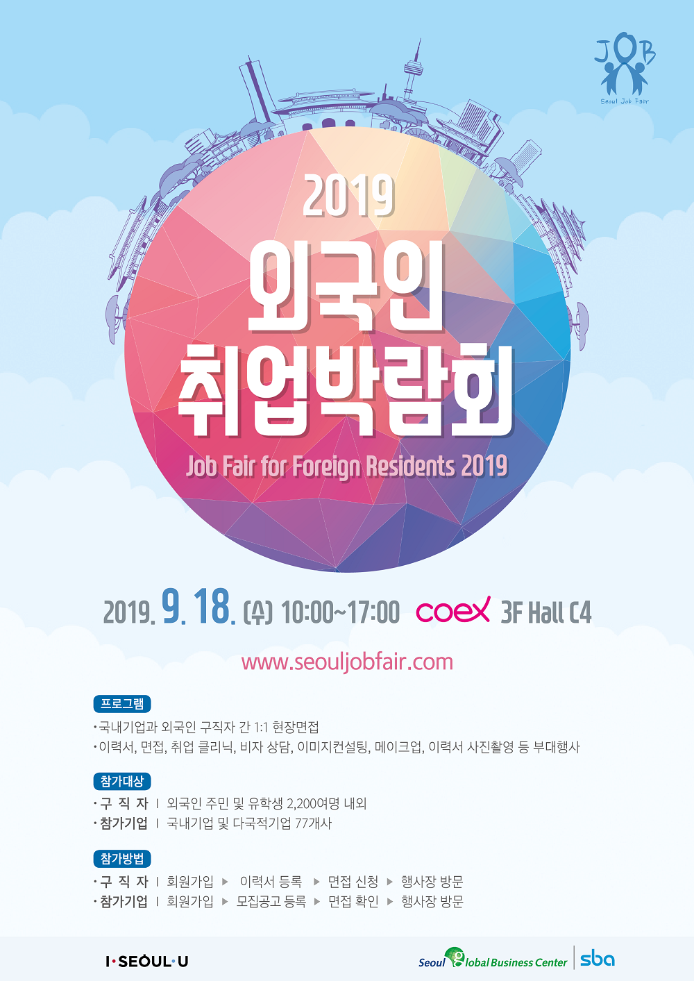 일시2019. 09. 18(수), 10:00~17:00장소코엑스 3층 Hall C4참가대상취업을 원하는 외국인주민및 유학생행사구성참가기업과 외국인 구직자 간 채용 상담 및 면접 진행주최서울특별시주관서울글로벌비지니스센터, SBA기업신청기간박람회 사무국문의개인신청기간사전접수및 행사당일 참석문의처02-6925-1242FAX02-6925-1243담당자E-MAILsupport@koreajobfair.com사이트(출처)http://www.seouljobfair.com/취업박람회 행사 참여전 개최여부를 꼭 확인 하시길 바랍니다.-잡815