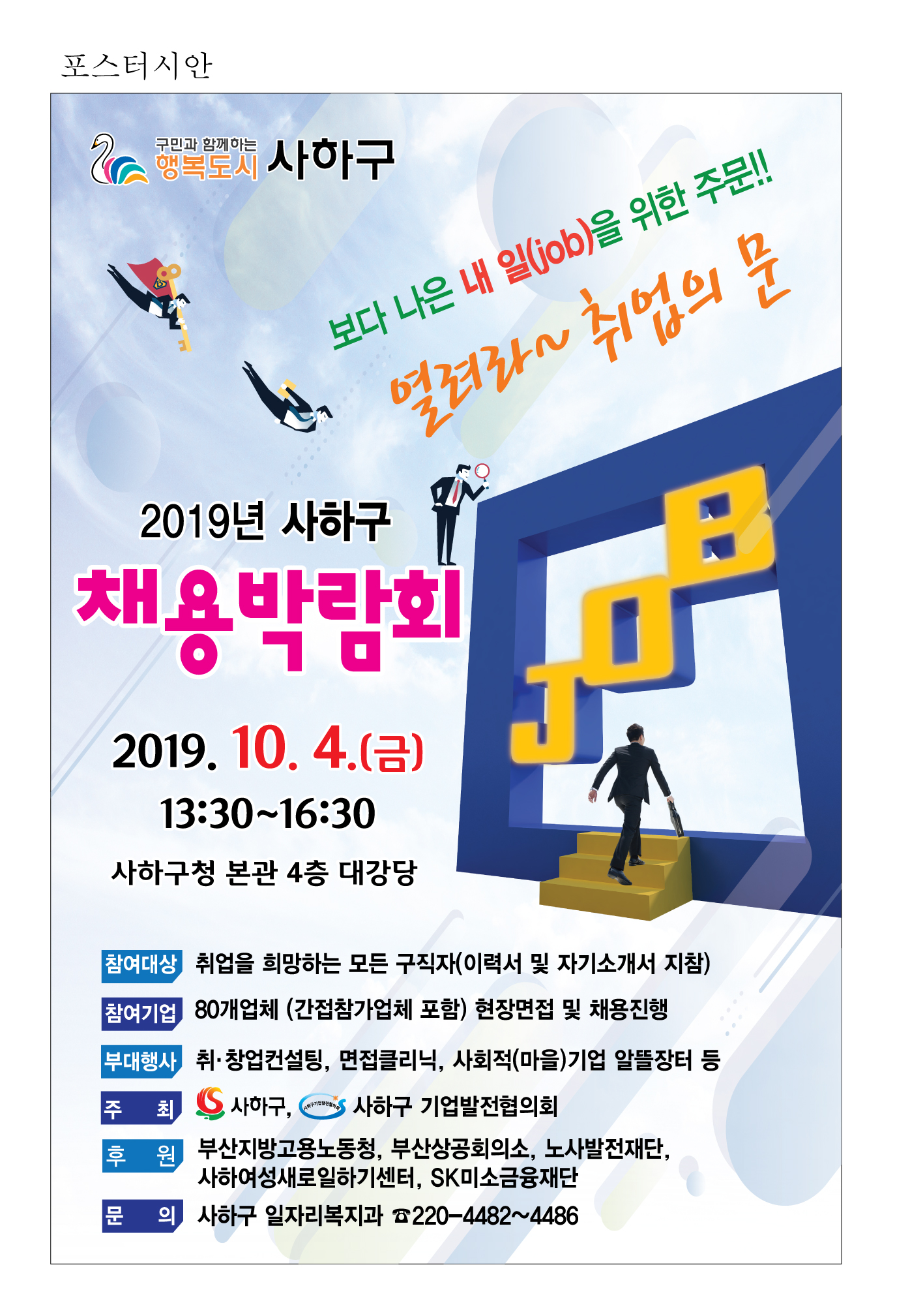 사하구 『2019년 사하구 채용 박람회』 를 다음과 같이 개최하오니 구인이 필요한 업체와 취업을 희망하시는