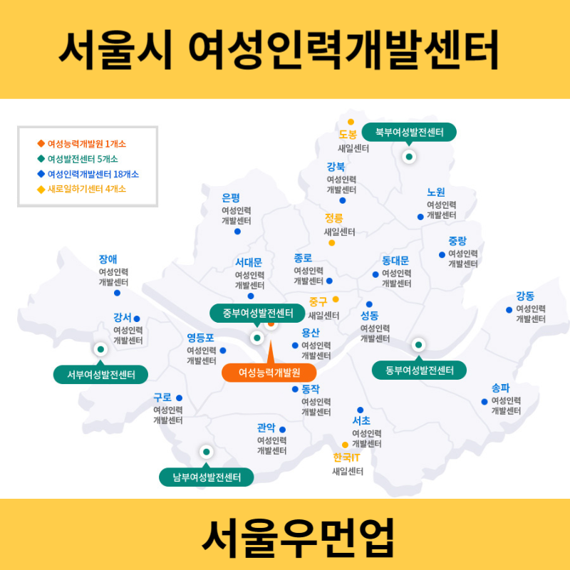 서울우먼업이란 서울시내 24개여성인력개발기관 네트워크 입니다.서울우먼업(Seoulwomanup)은 서울시내 18개 여성인력개발센터와 5개 여성발전센터,그리고 서울시여성능력개발원을 통칭하는 이름입니다.서울시내 24개 여성인력개발기관의 네트워크가 일하는 여성이 행복한 도시를함께 만들어갑니다.