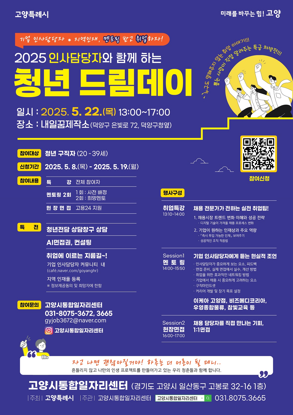 2025 인사담당자와 함께 하는 청년 드림데이는 청년 구직자 여러분이 실질적인 도움을 받을 수 있도록 고양시통합일자리센터가 준비한 특별한 취업지원 행사입니다! 이번 청년드림데이 행사에 참가하고자 하시는 분들은 아래 링크를 통해 취업박람회 참여기업및 부대행사, 준비물등 참가방법을 확인 하시기 바랍니다.