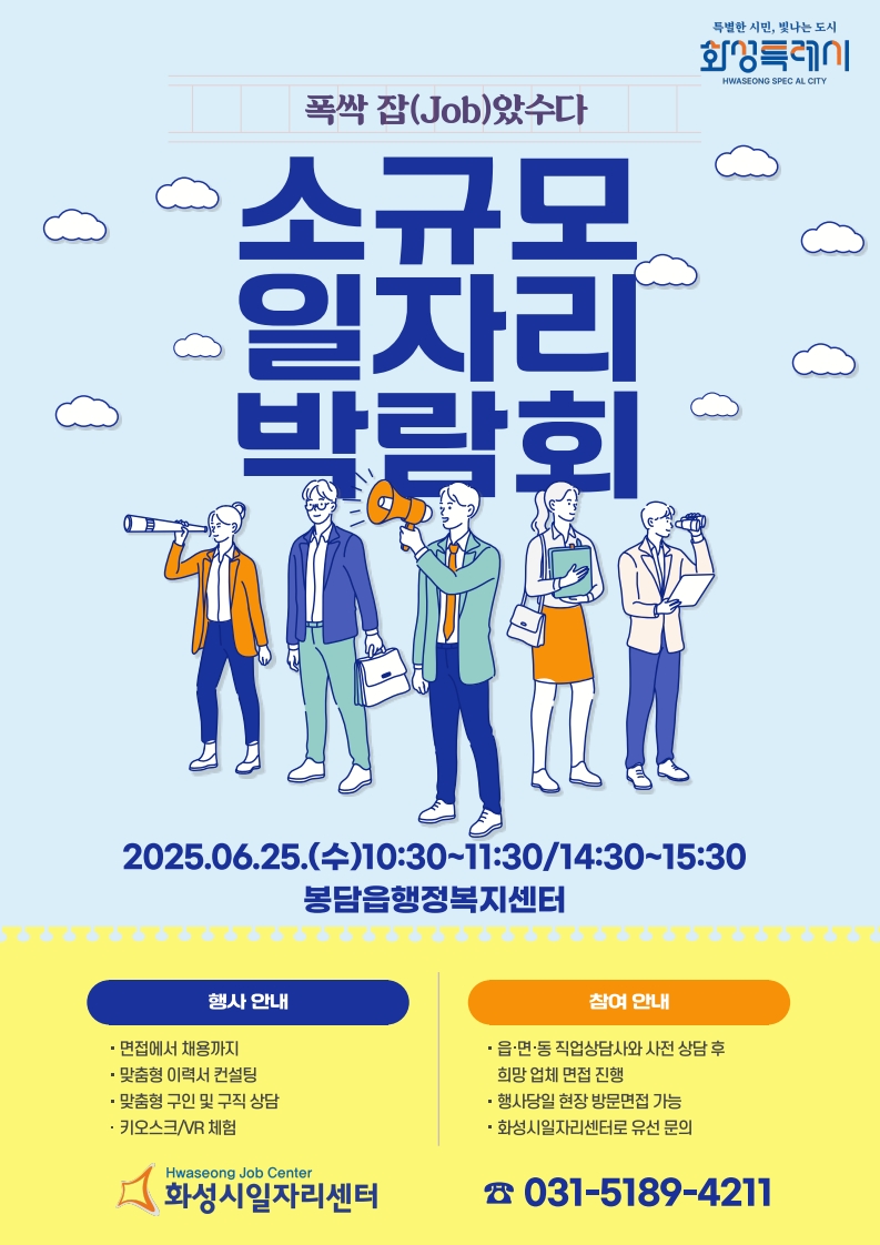 2025년 화성시 소규모 일자리박람회 행사를 다음과 같이 진행하오니 행사에 참여를 희망하시는 업체에서는 참고하시어 참가 신청하여 주시기 바랍니다. 화성시 일자리박람회에 참가하고자 하시는 분들은 아래 링크를 통해 일자리박람회 참여기업및 부대행사, 준비물등 참가방법을 확인 하시기 바랍니다.