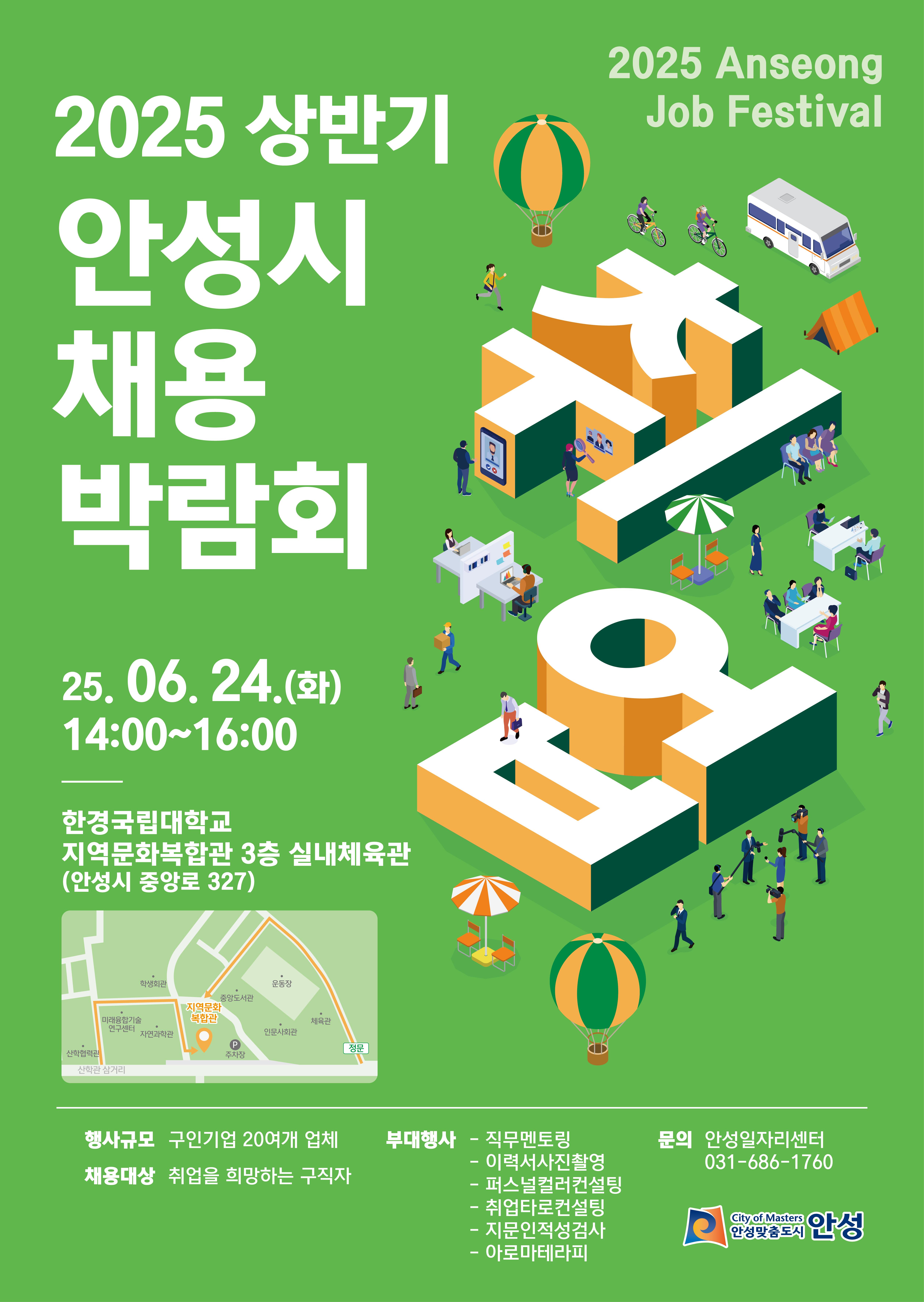 취업을 희망하는 구직자와 인재를 필요로 하는 기업체의 만남의 장인 「2025 안성시 상반기 채용박람회」를 아래와 같이 개최하오니 많은 참여 바랍니다. 채용박람회에 참가하고자 하시는 분들은 아래 링크를 통해 채용박람회 참여기업및 부대행사, 준비물등 참가방법을 확인 하시기 바랍니다.