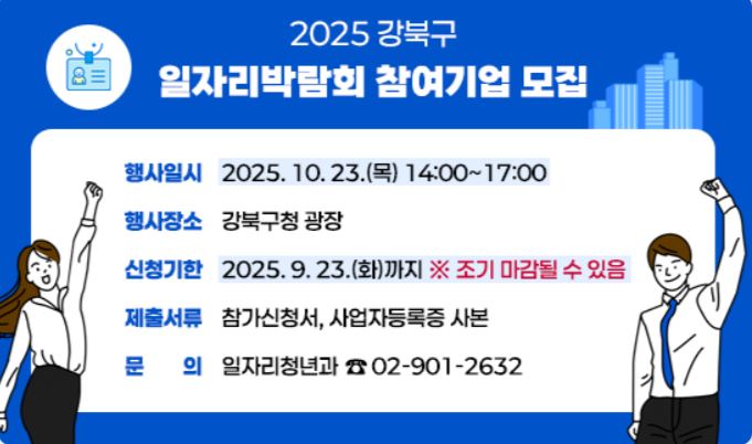 기업에게는 우수 인재 채용의 기회를, 구직자에게는 취업 기회를 제공하고자 「2025 강북구 일자리박람회」 참여기업을 모집하오니, 많은 신청 바랍니다. 일자리박람회에 참가하고자 하시는 분들은 아래 링크를 통해 일자리박람회 참여기업및 부대행사, 준비물등 참가방법을 확인 하시기 바랍니다.