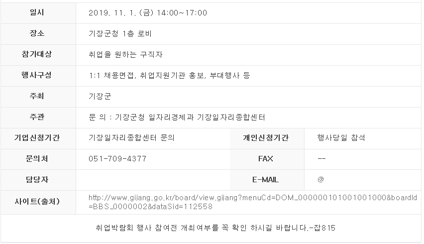 채용할 수 있는 만남의 장을 제공하고자 『2019 기장군 일자리박람회』를 개최하오니, 구직자